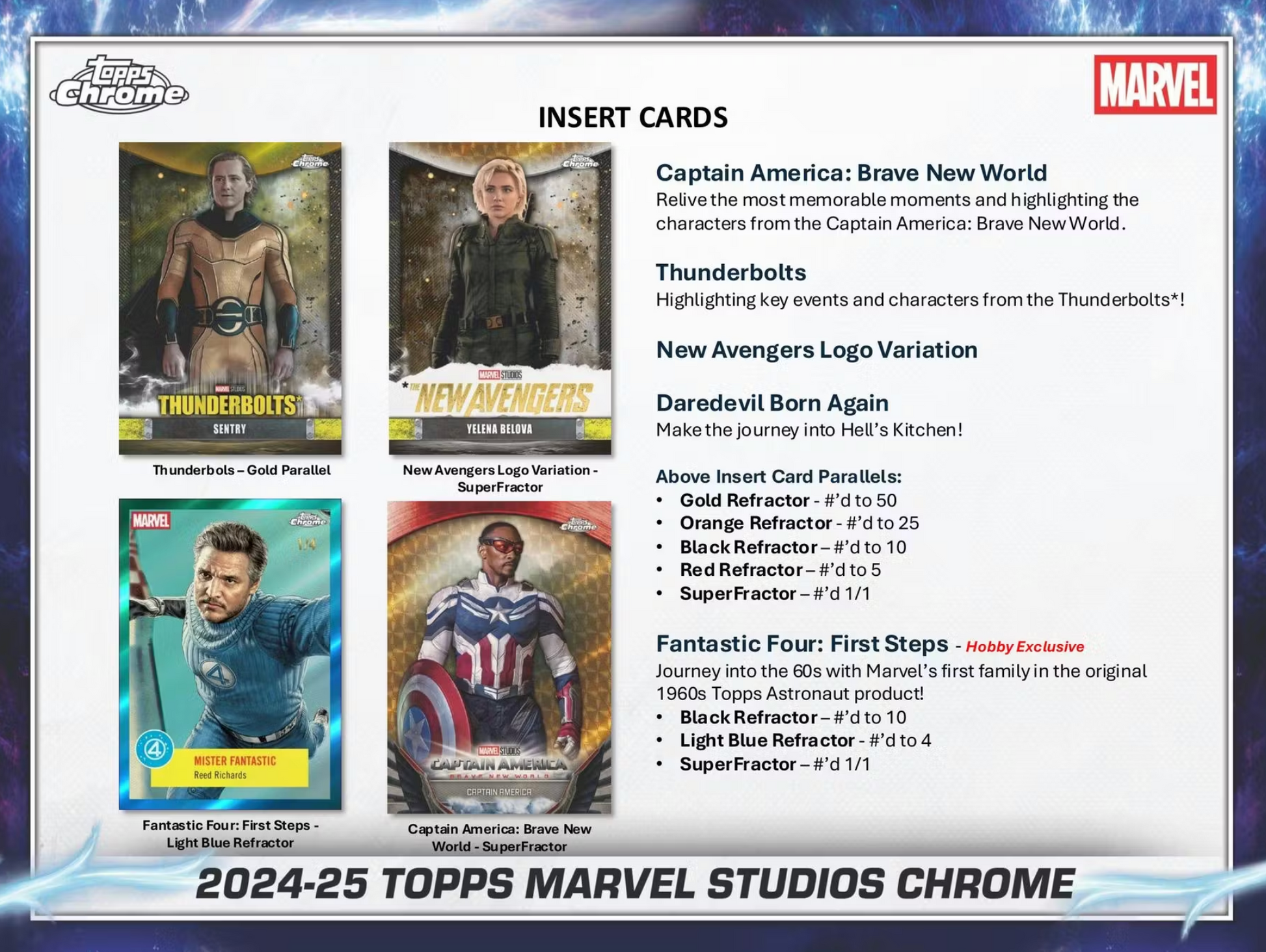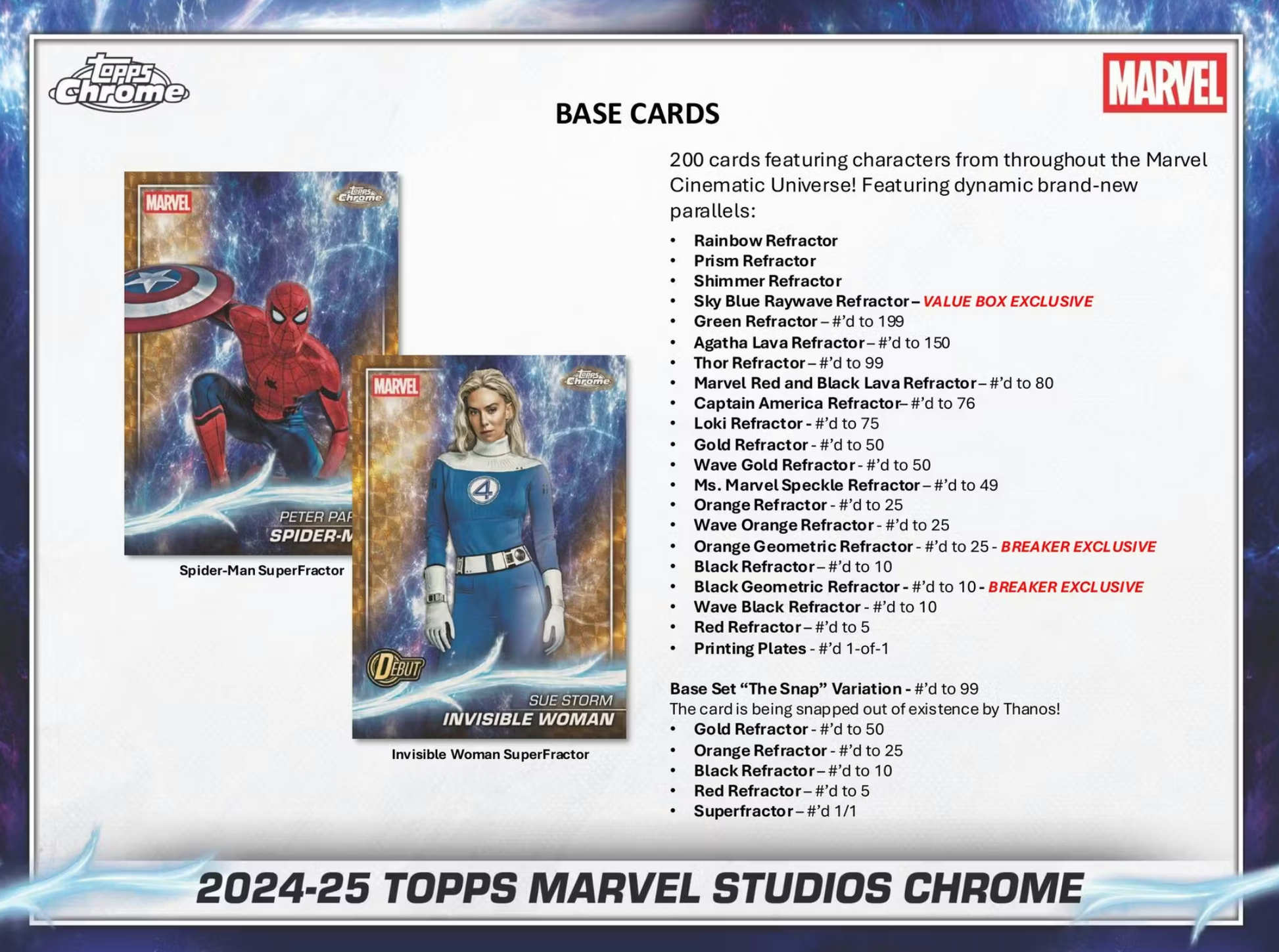 2025 Topps Marvel Studios Chrome arrives as the first ever Topps product featuring characters from the Marvel Cinematic Universe! Also look out for DEBUT cards featuring a brand-new, heroic medallion design indicating a character's first ever trading card!