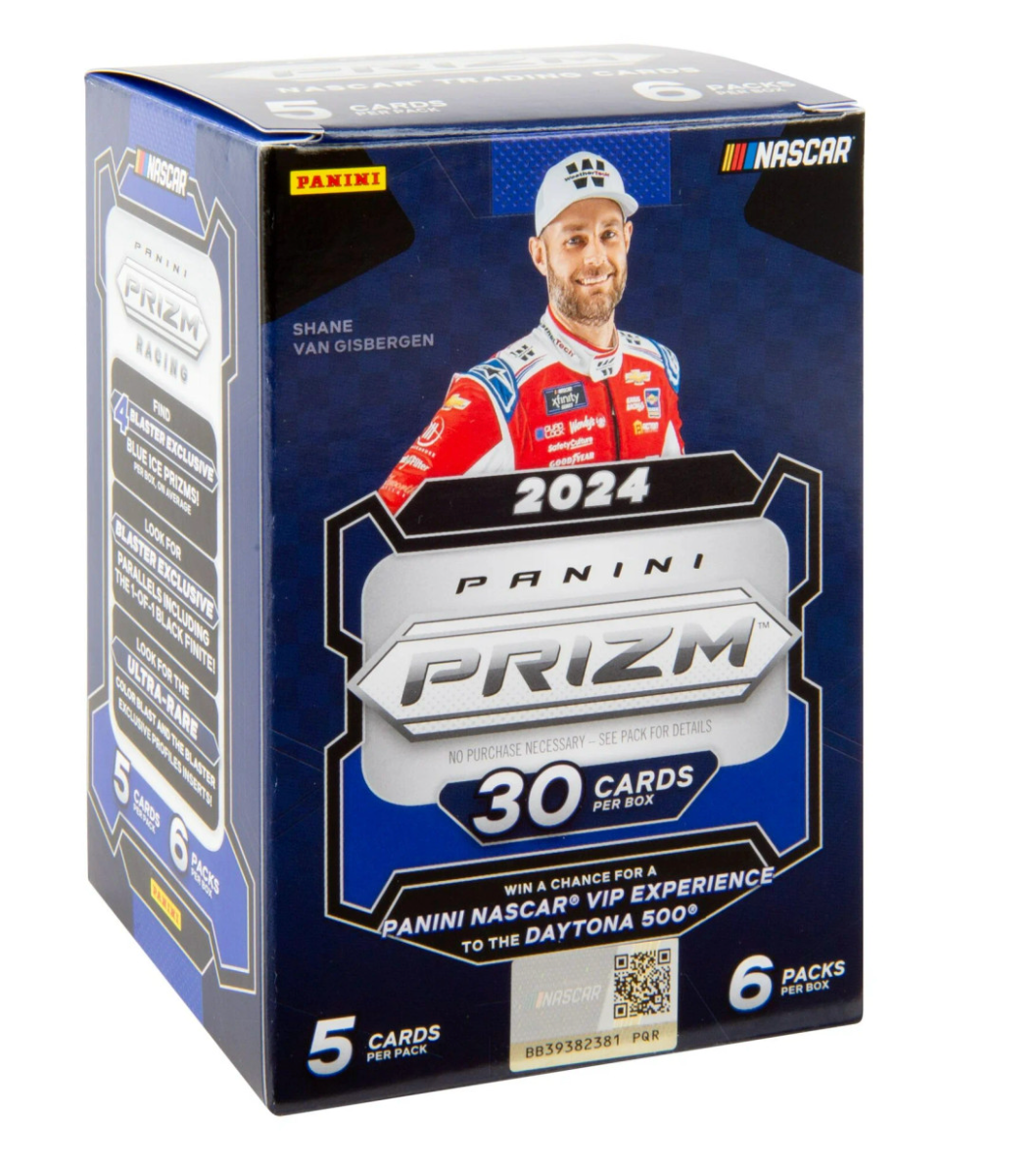 Panini presents the 2024 NASCAR Prizm Racing Trading Card Blaster Box. Each box contains 6 packs with 5 cards per pack. Look for Blaster Exclusive Red Ice Prizms! Look for Blaster Exclusive Parallels including the 1-of-1 Black Finite! Look for the Ultra-Rare Color Blast and the Blaster Exclusive Profile inserts! Content may vary.