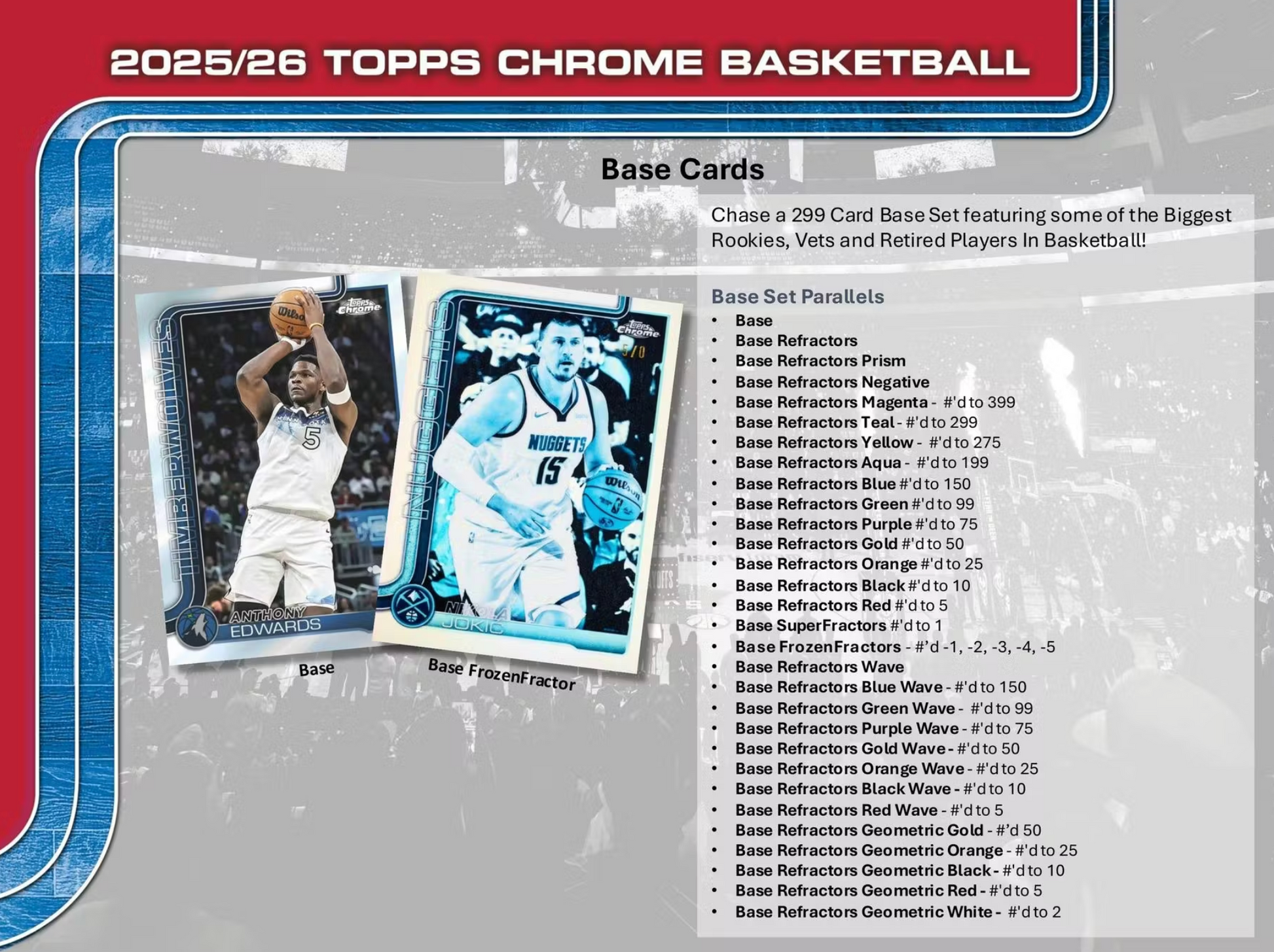 Topps Chrome Basketball is back in 2026! Find and collect a 299 card Base set featuring some of the top Rookie, Vets and Retired players in Basketball!