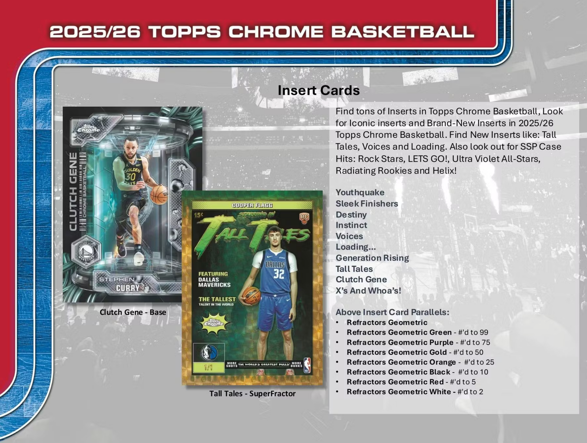 Find tons of Inserts in Topps Chrome Basketball, Look for Iconic inserts and Brand-New Inserts in 2025/26 Topps Chrome Basketball. Find New Inserts like: Tall Tales, Voices and Loading. Also look out for SSP Case Hits: Rock Stars, LETS GO!, Ultra Violet All-Stars, Radiating Rookies and Helix!