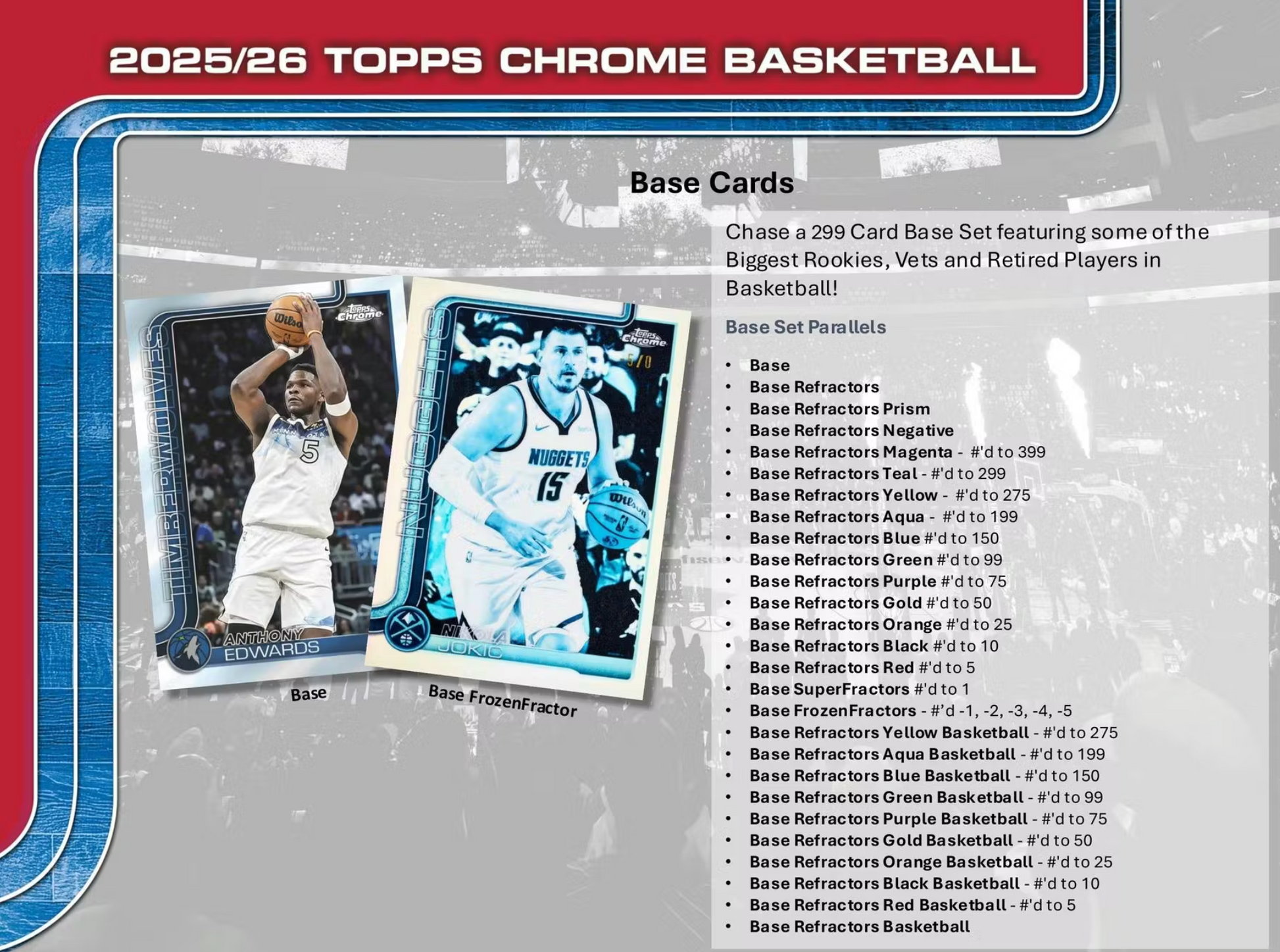 Topps Chrome Basketball is back in 2026! Find and collect a 299 card Base set featuring some of the top Rookie, Vets and Retired players in Basketball!