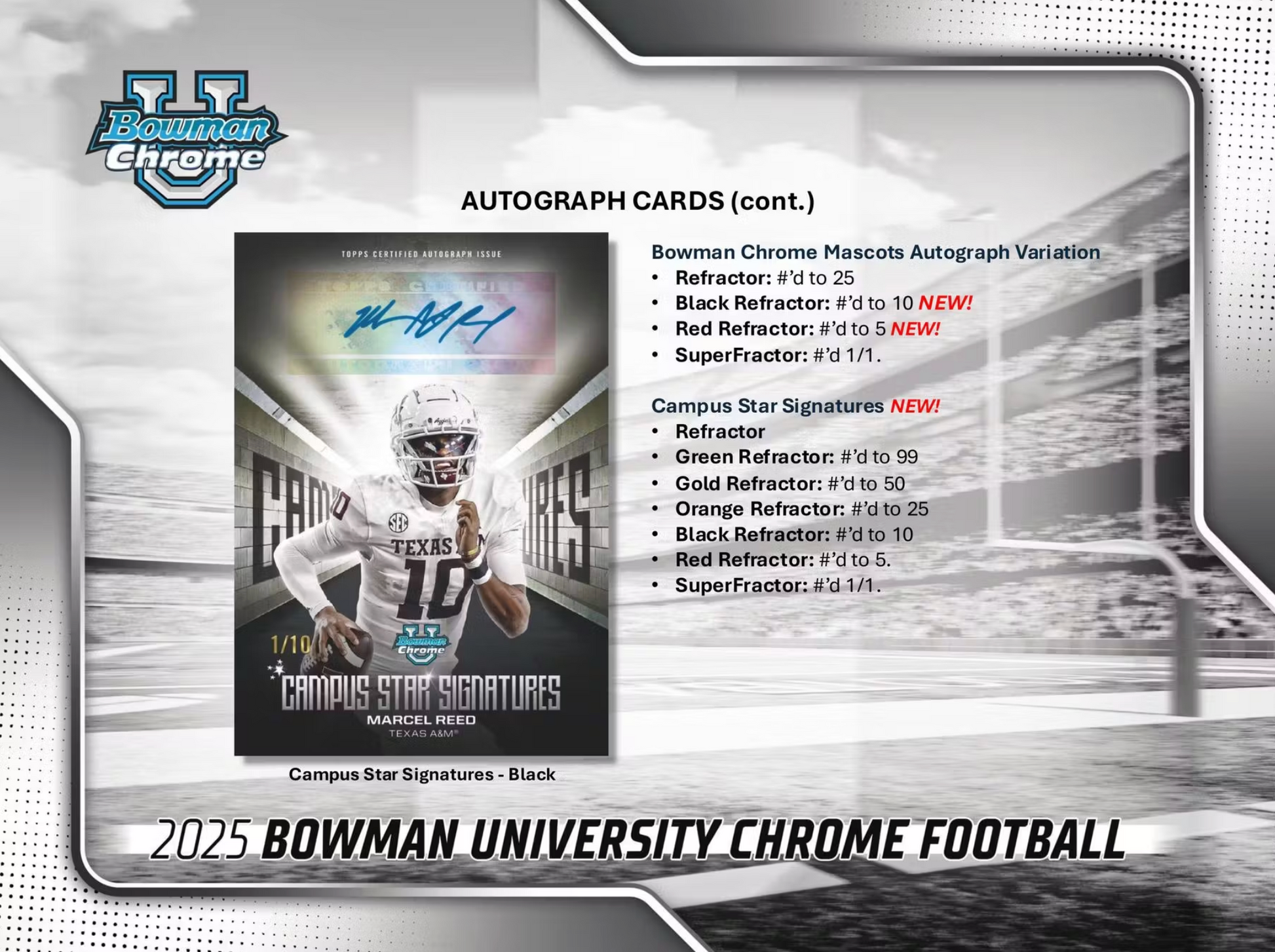 Get ready to storm the field, Bowman University Chrome Football is back for the 2025 College Football season! Look for the top prospects across the nation, with their very first Bowman Cards!