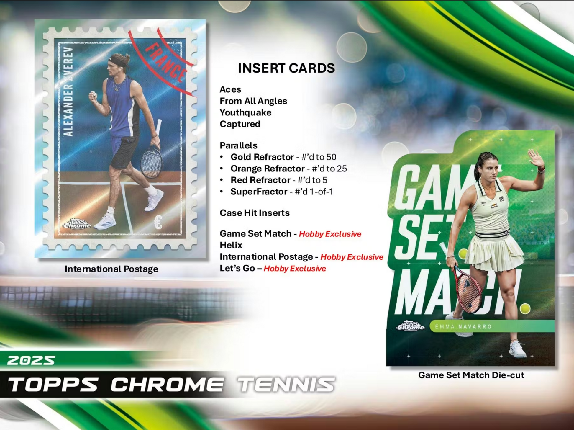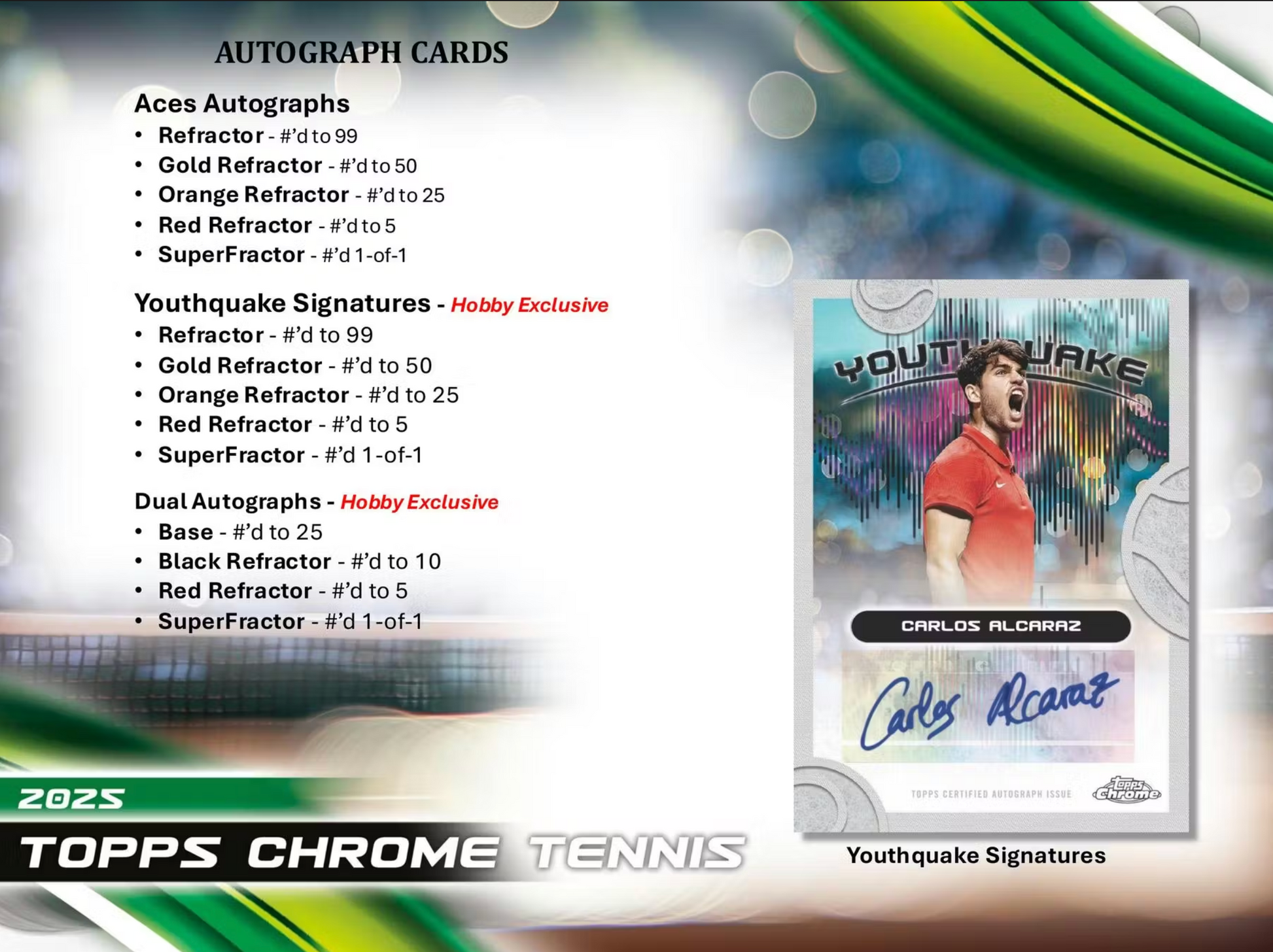 Topps Chrome Tennis returns with a new look featuring some of the greatest names in the game! Look for an all-new design style that will be accentuated with a wide-variety of chase parallels. Find several first-time signers across the autograph subsets.