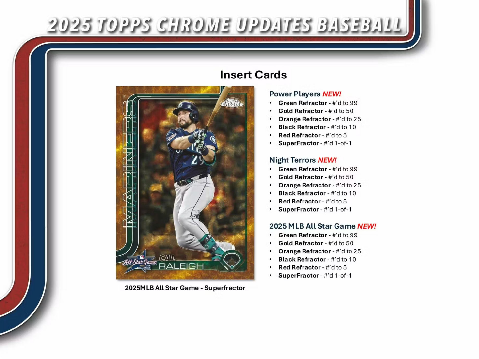 Each Box contains 1 Base Card Refractor Parallel, 1 Base Card Raywave Parallel, 4 Base Card Sepia Parallels, and 2 Inserts, on average!