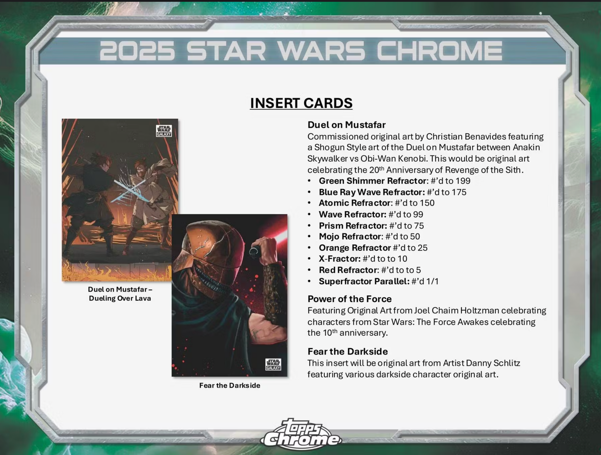This will be a five-card continuity insert with only 1/1 superfractors of characters from the lightside and the darkside of the force.