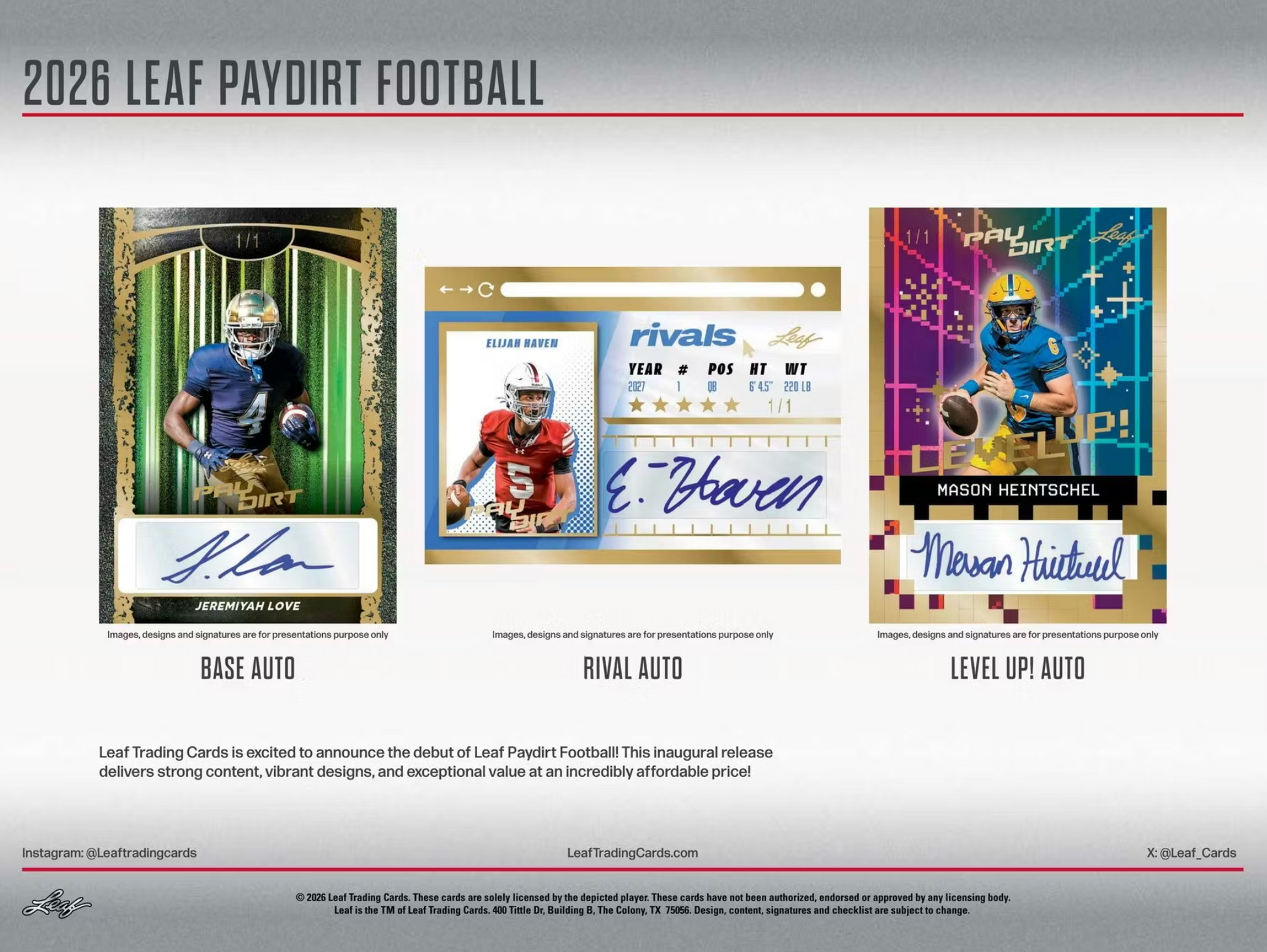 Leaf Trading Cards is excited to announce the debut of Leaf Paydirt Football! This inaugural release delivers strong content, vibrant designs, and exceptional value at an incredibly affordable price!