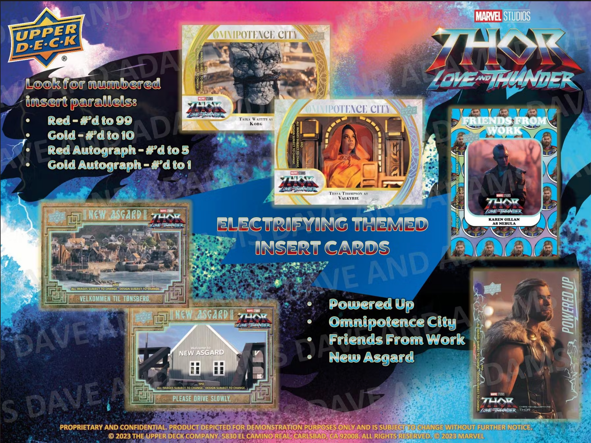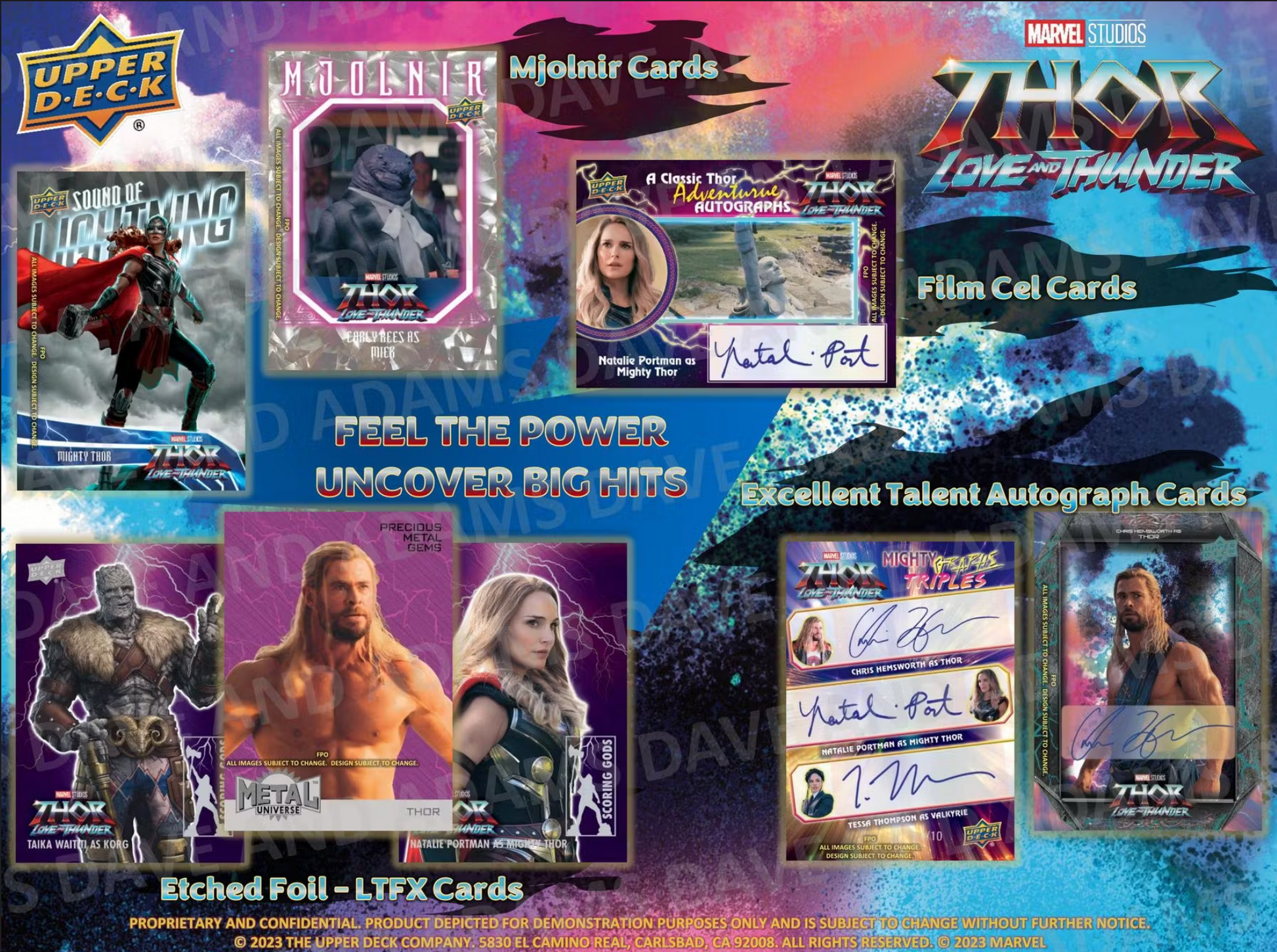Discover the power of love and thunder in this exciting trading card set - Marvel Studios' Thor Love and Thunder! Collect an 80-card Base Set along with themed insert cards, low numbered parallel cards, acrylic cards, manufactured film cels and talent autograph cards.